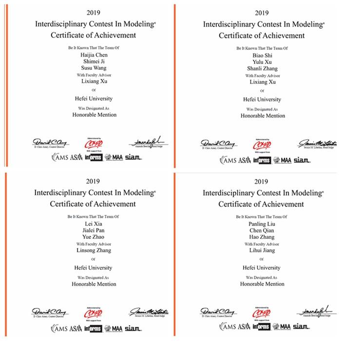 2019年美国大学生数学建模竞赛结果日前公布,合肥学院数理系、电子系、机械系学生在徐立祥、张林松、江立辉等教师指导下,荣获四项H奖(国际二等奖)。