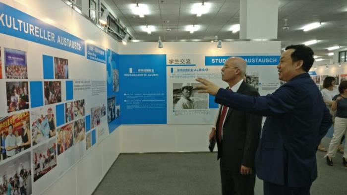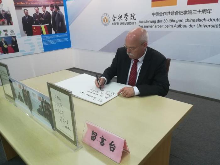 随后,双方参观了中德合作共建合肥学院成果展。蔡敬民、王其东为葛策博士一行详细讲解。蔡敬民表示,合肥学院是一所在“改革中诞生、开放中成长、创新中发展”的地方本科院校,早在2003年就提出“地方性、应用型、国际化”的办学定位,三十多年来通过借鉴德国应用科学大学办学经验,结合中国实践构建应用型人才培养体系,促进自身发展的同时,也示范引领了众多国内地方高校的转型发展。