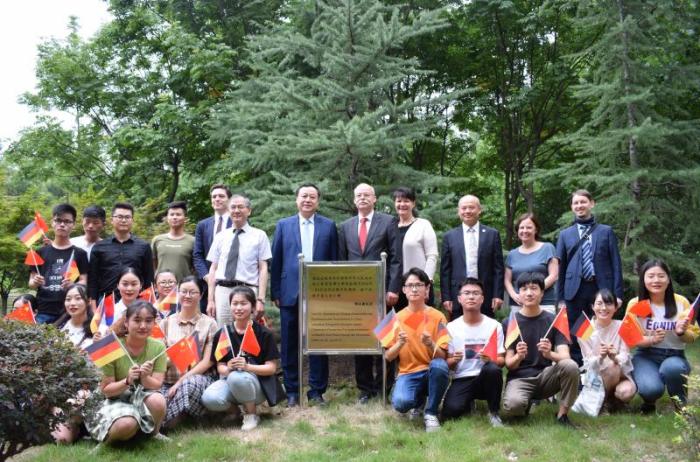 蔡敬民、王其东与葛策博士等人共同栽种了一棵中德友谊树并为其浇灌、揭匾,在场嘉宾与同学们共同合影留念,共庆合肥学院中德友谊林再添新株。
