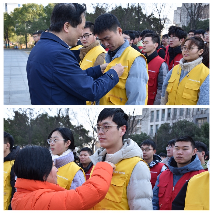 活动中,在场老党员重温入党誓词、新党员进行入党宣誓,由学院党委副书记、院长吕刚领誓。凛冽寒风中,大家面向党旗庄严宣誓,铮铮誓言,振聋发聩,表达了党员们为共产主义事业奋斗终身的坚定决心。宣誓结束后,学院党委委员分别为各学生支部新发展学生党员代表佩戴党徽,各位老师现场勉励新党员们在思想上行动上更加严格自我要求,积极向老党员学习,以实际行动践行入党誓词,不断提高思想觉悟,做一名优秀的共产党员。
