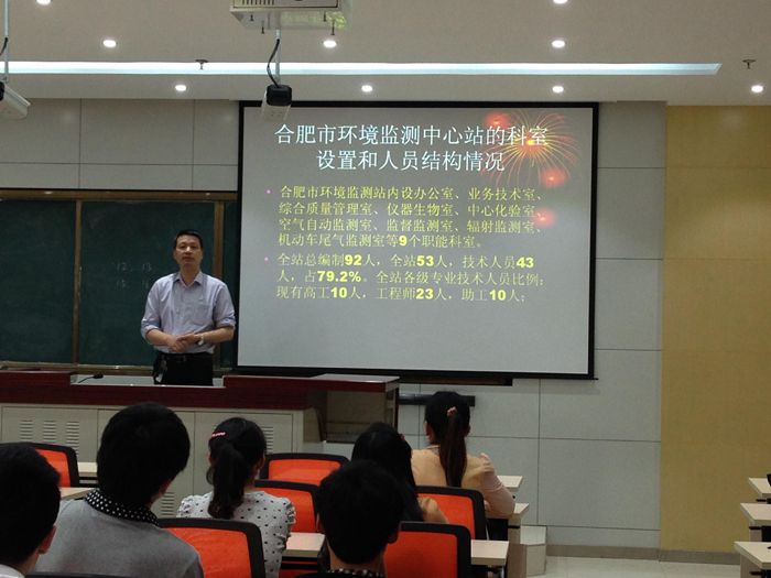 5月9日下午,“合肥市环境监测的现状和未来发展”的学术报告在我校35幢312报告厅举行,报告会主讲人是合肥市环境监测中心站副站长李菁。我校环境工程专业研究生及部分导师到场聆听。