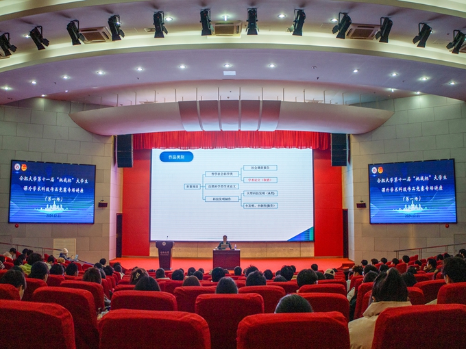 随后,由安徽诚恩文化科技发展有限公司总经理许飞主讲专场讲座。许飞细致地从赛事分类、参赛作品申报、评审标准等方面进行介绍,引用“田忌赛马”深入浅出地说明主体赛与专项赛的重要性,并围绕往年优秀作品分享自己的见解。他提议参赛者把握“时间早”和“主题正”的选题逻辑,写好调查报告,强化成果运用。讲座最后,师生们积极踊跃提问,许飞一一细致回复和指导。