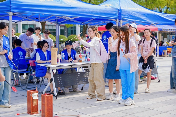 南艳茶舍以茶艺文化浸润人心,手工舍展出手工艺品制作技艺,科创星辰舍呈现科技创新成果……各社团通过实物展示与互动体验,立体化展现校园多元文化魅力。青年服务中心特设减压游戏区,以轻松有趣的互动拉近社团与学生的距离。