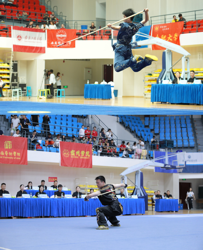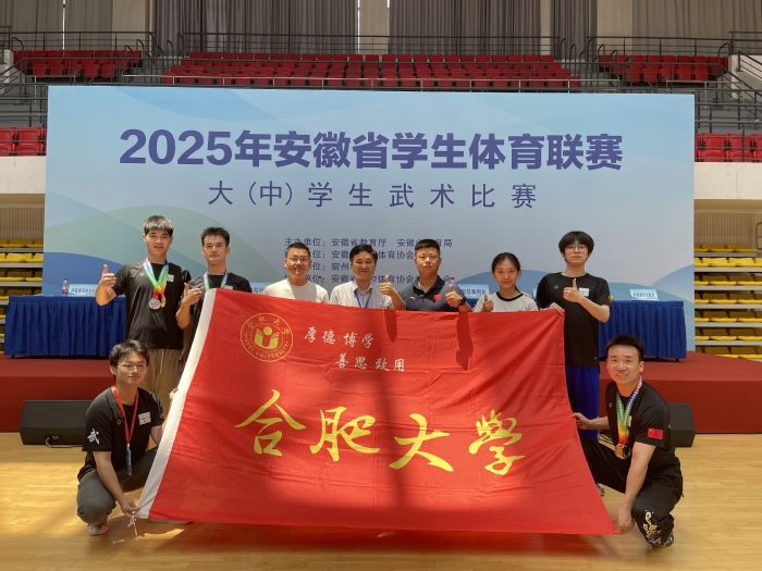 6月18日至23日,2025年安徽省体育联赛大学生武术比赛在宿州学院举行。全省44个代表队、590名运动员参加比赛,我校武术队在毛献亮、徐军老师的指导下,参加了长拳、南棍、南拳、对练等7个项目的比赛,获得2金2银的优异成绩。其中,孙晨荣获男子甲组自选南棍冠军,徐家豪夺得男子甲组自选长拳冠军,孙晨在男子甲组南拳获得亚军,徐家豪、孙晨、王星墨组成的对练队伍在甲组对练项目中摘得银牌。