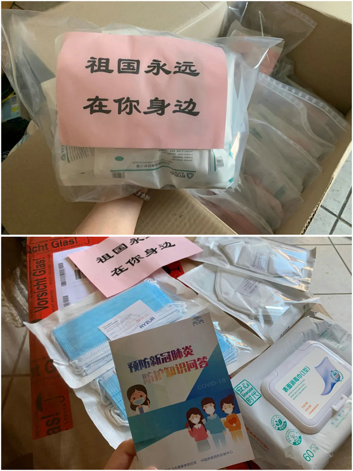 “爱心防疫包”包含N95口罩两只、医用外科口罩两盒共二十只、表面消毒巾一包及《新冠防疫知识问答手册》一份。在德国市场防疫物资相对匮乏的时刻,这份母爱显得尤为珍贵。同学们在网上和朋友圈纷纷晒出图片,表达对祖国温情的感激,对使领馆、在德物资提供企业及学联工作人员奉献爱心辛苦工作的感谢,并衷心祝愿祖国繁荣昌盛,祝福德国早日走出疫情的阴霾!