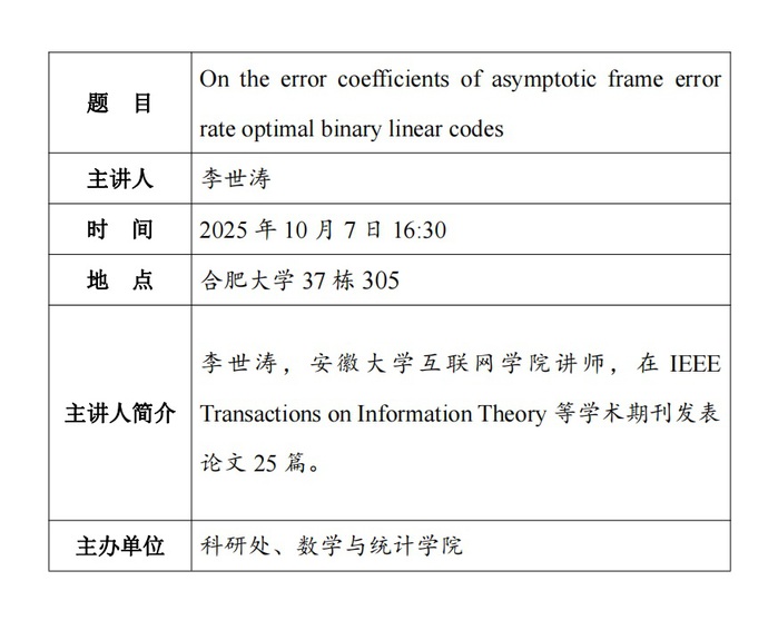 【善思讲坛】On the error coefficients of asymptotic frame error rate optimal binary linear codes