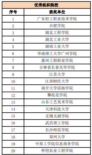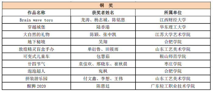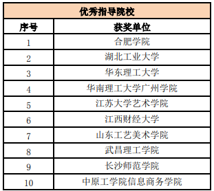 我校设计学院学生宛枫在赵静老师指导下获得最具商业价值奖1项,铜奖1项,吴翔在高京老师指导下获得铜奖1项,谭淼在赵静老师指导下获得优秀奖1项,覃柳生在高京老师指导下获得优秀奖1项,获得鼓励奖3项。合肥学院获优秀指导院校奖和优秀组织院校奖。