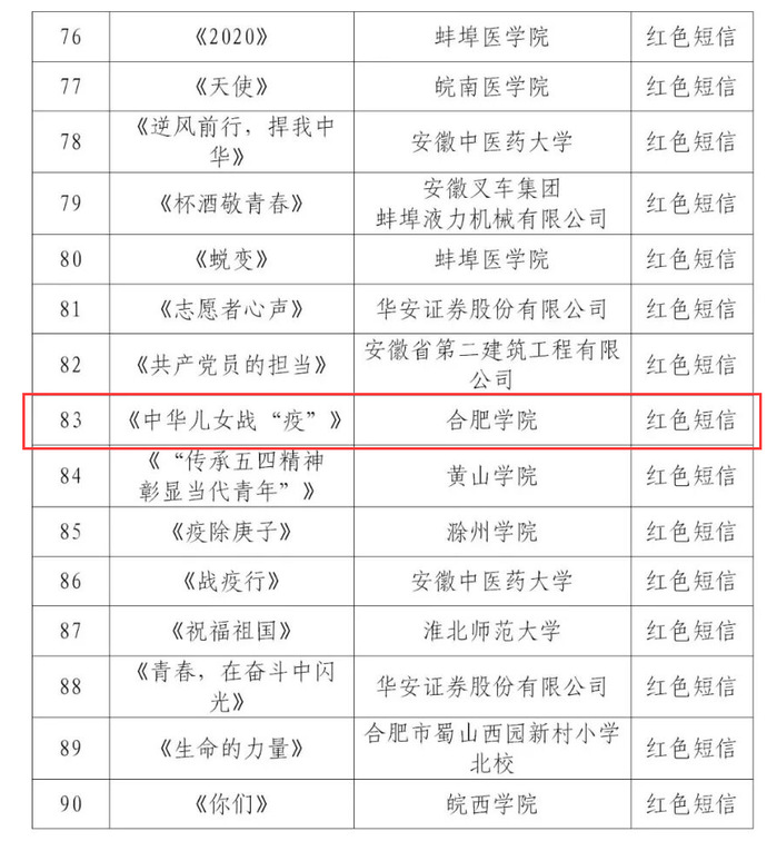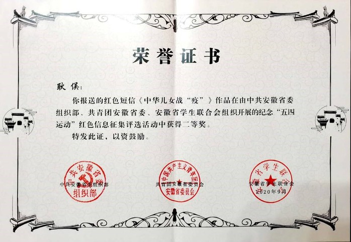 日前,安徽省委组织部、共青团安徽省委、安徽省学生联合会公布了《安徽省疫情防控和决战决胜脱贫攻坚红色信息征集活动获奖名单》,我校先进制造工程学院学生工作办公室主任耿俣老师的作品《中华儿女战“疫”》(诗歌)荣获二等奖。