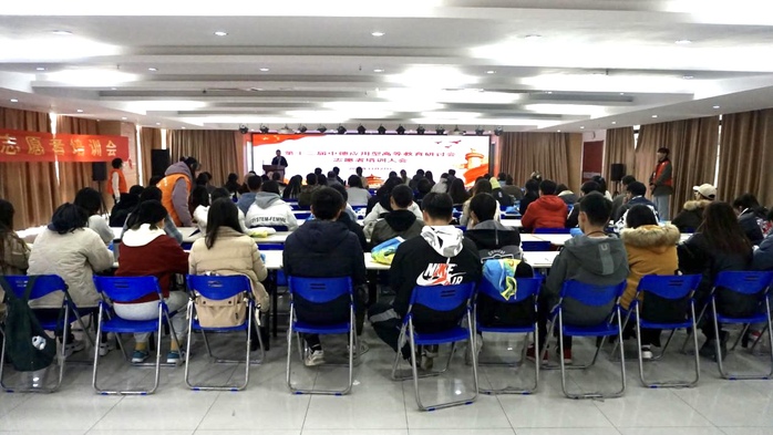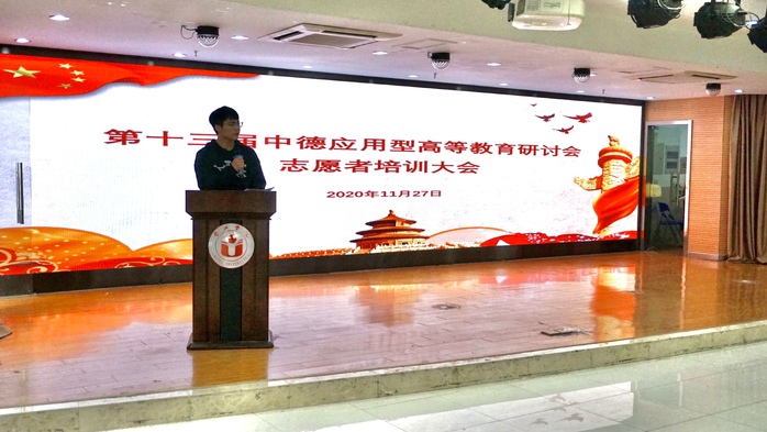 11月27日中午,第十三届中德应用型高等教育研讨会志愿者培训大会在大学生活动室举行。校团委杜娟书记、中德应用型高校教师能力发展中心副主任陶龙泽及两百余名志愿者参会。会议由校青志联主席汪朋主持。