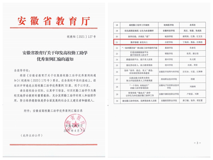 近日,安徽省教育厅下发《关于印发高校勤工助学优秀案例汇编的通知》,合肥学院选送勤工助学案例《勤学修德奋发向上》被遴选为高校勤工助学优秀案例,在全省高校推广学习。