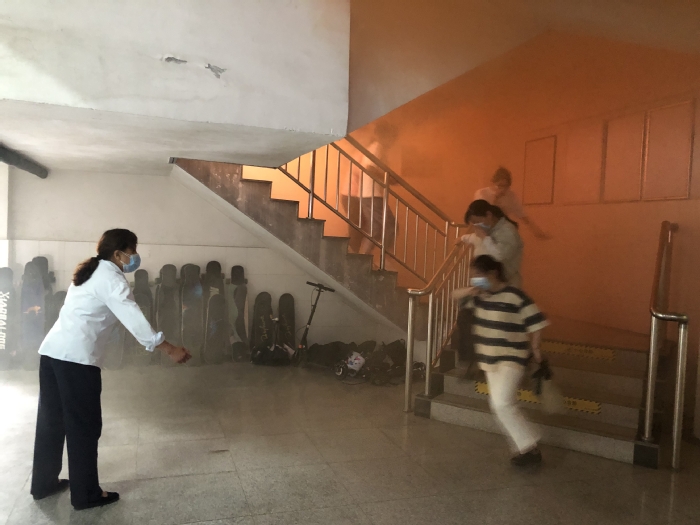 演练分三个阶段进行:5月8日下午,保卫处联合参演部门在行政楼第二会议室召开演练协调会,明确演练的任务分工及组织过程中的安全注意事项;5月11日中午13时30分,在女生宿舍25幢、26幢组织演练;5月12日中午13时30分,在男生宿舍45幢、46幢组织演练。