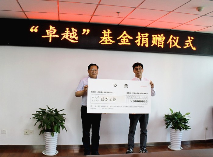 Am Nachmittag des 31. Mai fand die Spendenzeremonie der Zhuoyue-Stiftung, die vom Zhuoyue Bildungsinstitut für Design in Anhui gegründet wurde, an der Universität Hefei statt. Daran nahmen der Leiter der Designschule Herr Wang Ruoyi und zwei seiner Kollegen, der stellvertretende Direktor der Geschäftsentwicklungsabteilung der Stiftung für die Bildungszusammenarbeit zwischen China und Deutschland und Direktor der Abteilung für Studentenangelegenheiten Zhu Tao, der Direktor der Finanzabteilung und Generalsekretär der Stiftung He Shikun, der stellvertretende Direktor des Alumni & Jubiläumsbüros Chen Changyue und der Direktor für Architekturabteilung Tao Feng teil. Die Zeremonie wurde vom Direktor des Verwaltungsbüros der Stiftung Liu Jinping moderiert.