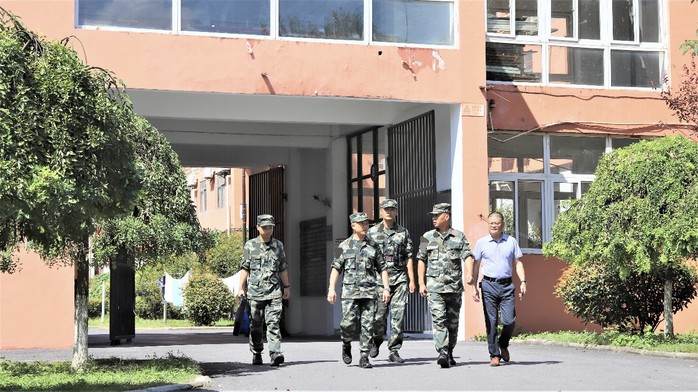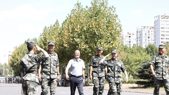 9月20日上午,武警某总队王参谋长和某支队张支队长来到我校军训现场视察指导工作。在校党委武装部部长李泽远的陪同下,参观了各位教官的宿舍和一期二期的军训现场。