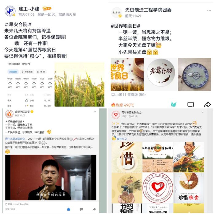 校青年志愿者联合会通过网络新媒体平台推送了“粮食周”宣传推文,通过向同学们宣传节约珍惜粮食的古诗句和“水稻之父”袁隆平的故事等,普及爱粮节粮知识;校院两级青年志愿者服务队在校内开展了随机采访、“爱粮之星”知识比赛、“光盘行动随手拍”等系列活动,在校内掀起了一股爱惜粮食和“光盘行动”的热潮。