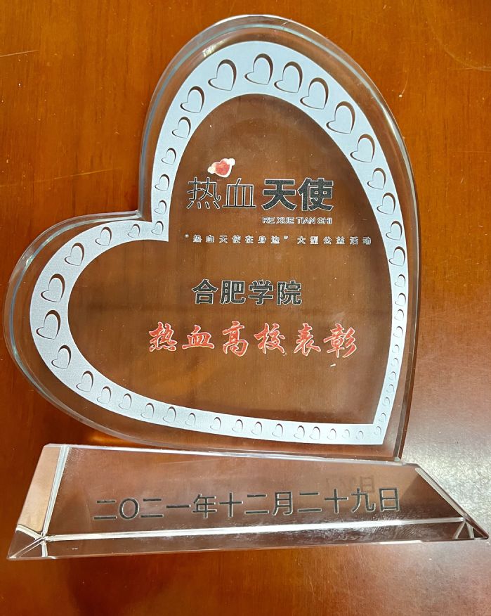 12月29日,由安徽省红十字会和安徽省卫健委指导,安徽省血液管理中心、合肥市卫健委、合肥市红十字会主办,安徽省血液中心、合肥市中心血站、新浪安徽承办的2021“高校热血天使”颁奖典礼在安徽电视台举办。我校荣获“热血高校”奖,我校学生王鸿志、叱干文强获热血贡献表彰,祝金琴获热血鼓励表彰,张政获热血参与表彰。