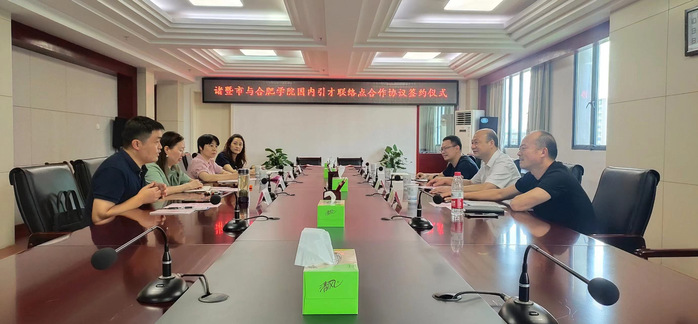 张应杰与应仲九签订了合肥学院与诸暨市国内引才联络点合作协议。