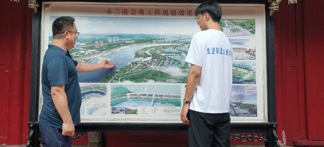 图为当地工作人员向调研成员介绍木兰坡防洪构造