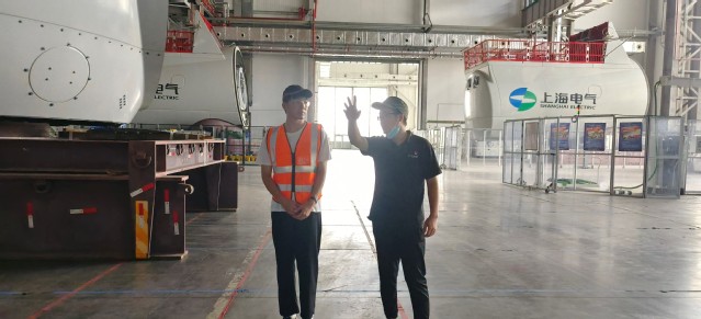 图为上海电气风电设备莆田有限公司工作人员带领调研成员参观工厂车间