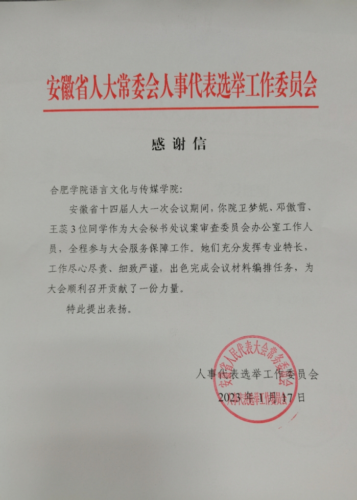1月11日至17日,我校语言文化与传媒学院的卫梦妮、邓傲雪、王蕊三位同学圆满完成安徽省第十四届人民代表大会一次会议的实习任务,受到省人大领导的高度评价,并向我校发来感谢信。
