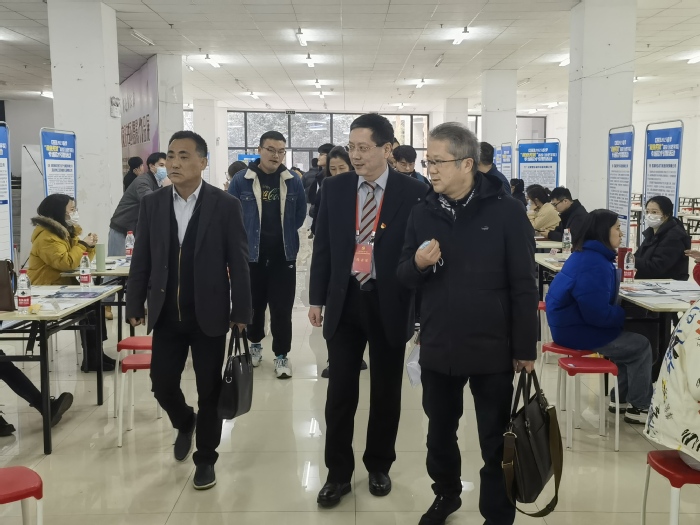 为加强校地合作,推动毕业生高质量就业,2月28日,合肥市新站经开区和芜湖市鸠江区合肥学院专场招聘会在学校图书馆招聘大厅举办。芜湖市鸠江区人大常委会副主任许洋、区人力资源和社会保障局局长肖宗明,安庆市宿松县劳动就业管理局局长朱志刚,院长吴春梅、党委副书记刘建中到招聘会现场调研指导工作,党委委员、学生处处长朱涛陪同。
