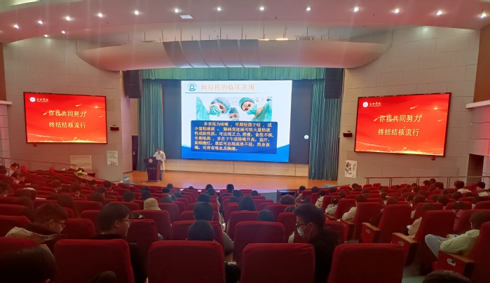 专题讲座普及防治知识。活动邀请合肥市第三人民医院辛捷医师来校开展预防结核病宣传教育专题讲座,200余名学生参加。辛医生结合临床实践,从肺结核的定义、临床表现、预防措施、治疗方法以及国家免费治疗政策等方面进行了详细讲解,呼吁同学们勤洗手、多通风、强身健体,讲座现场还发放了宣传折页和结核病防治知识调查问卷,进一步增强了学生对结核病的防治知识。