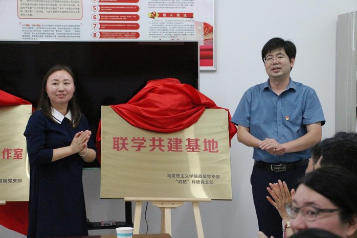 随后,马克思主义学院院长陈志超、杜娟和陶龙泽共同为马克思主义学院“一站式”学生社区工作室和“联学共建基地”揭牌。