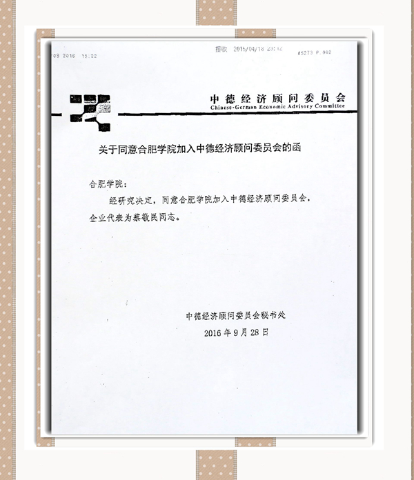 Am 28.09.2016 erteilte der chinesisch-deutsche beratende Wirtschaftsausschuss des chinesischen Handelsministeriums in einem offiziellen Schreiben an die Universität Hefei die offizielle Genehmigung zu ihrer Beteiligung am chinesisch-deutschen beratenden Wirtschaftsausschuss. Als Vertreter wurde der Parteisekretär der Universität Hefei, Prof. Cai Jingmin, ernannt. Die Universität Hefei gilt als der erste Hochschulvertreter des Wirtschaftsausschusses und wird im Oktober an der Rundtisch-Konferenz zur industriellen Zusammenarbeit zwischen Deutschland und China (Provinz Anhui) in Peking teilnehmen.