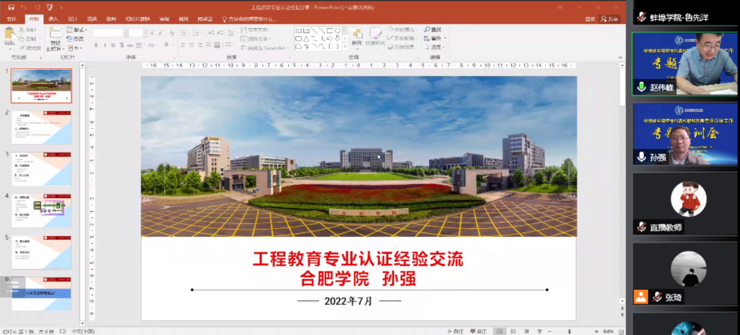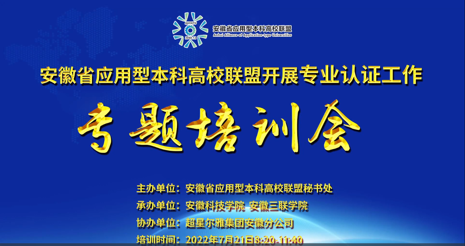 7月21日上午,由安徽省应用型本科高校联盟主办,安徽科技学院、安徽三联学院承办,超星尔雅集团安徽分公司协办的安徽省应用型本科高校联盟专业认证专题培训会成功举行。本次会议采用直播形式进行线上培训,来自安徽省应用型本科联盟24所高校负责专业认证工作的职能部门负责人及核心工作人员、相关专业负责人及骨干教师参会,在线参会人数为3809人。会议由安徽科技学院教务处处长赵伟峰主持。