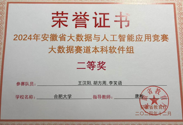 对于王汉阳来说,学习从来都不局限于课堂。他曾经参加过“挑战杯”、“互联网+”、大数据与人工智能应用竞赛等大大小小的科研竞赛,其中多次获得了理想的成绩。在安徽省大学生网络与分布式系统创新设计大赛中,他与队友们齐心协力,面对复杂的赛题,他们不畏惧、不退缩。经过连续多日的艰苦奋战,不断尝试各种解决方案,最终成功突破重重难关,荣获大数据应用赛道三等奖。这次经历让他深刻体会到团队协作的无穷力量,也激发了他在竞赛道路上继续前行的斗志。此后,他又勇敢地踏上了安徽省大数据与人工智能应用竞赛的征程。在比赛过程中,他们遭遇了诸多技术难题和时间紧迫的双重压力。然而,王汉阳凭借扎实的专业知识和冷静的头脑,带领团队成员深入分析问题,查阅大量资料,经过反复调试和优化,成功找到了解决方案,在众多参赛队伍中脱颖而出,斩获了大数据赛道二等奖。这些竞赛经历不仅磨砺了他的专业技能,更培养了他坚韧不拔的毅力和创新思维。