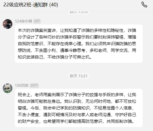 院党委副书记姚蓓蓓在总结讲话中指出,防范电信诈骗是校园安全工作的重中之重。她提出三点要求:一要牢固树立安全意识,自觉抵制网络诱惑;二要提高信息甄别能力,对可疑网络链接保持警惕;三要坚决杜绝参与任何形式的刷单等违法违规行为。学院将持续深化安全教育工作,通过多元教育形式,筑牢安全防护网。