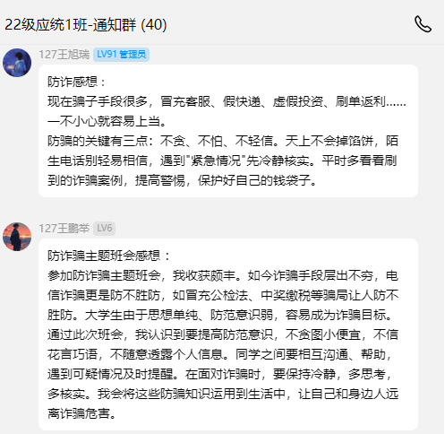 本次主题班会不仅为全体同学敲响了防诈反诈的警钟,更系统普及了电信诈骗的防范要点与处理办法。通过此次活动,同学们深刻认识到防范电信诈骗的重要意义,全面掌握了识别和应对电信诈骗的关键技能,有效提升了网络安全风险防范能力。同学们纷纷表示将在今后的学习生活中始终保持警惕,自觉践行安全防范要求,共同维护平安和谐的校园环境。