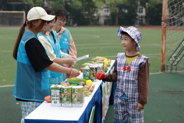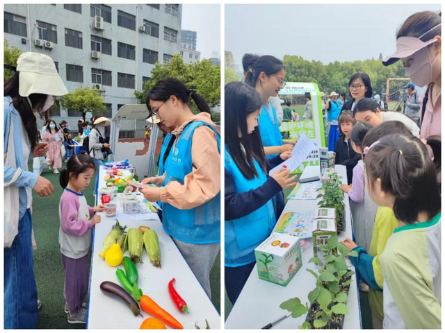 亲子互动的“蔬果奥运会” 热闹非凡,南瓜保龄球、玉米接力赛等项目,让家长与孩子携手在欢乐中竞技,获胜者可兑换环保小礼物,既增进了亲子关系,又激发了大家参与环保的热情。“旧物大变身” 区域,学生党员带领大家将旧衣服改造成帆布袋、编织地垫,让废旧物品焕发新生,生动诠释了循环利用的环保理念。
