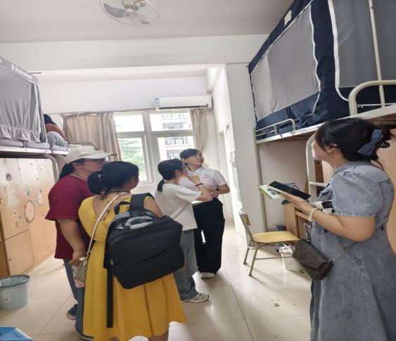 学院领导及辅导员老师仔细查看宿舍的床铺、桌椅、水电等设施,叮嘱新生注意用电安全,保持宿舍卫生,提防电信诈骗,尽快适应集体生活。针对新生提出的生活方面的困惑,答疑解惑帮助新生尽快融入学校大家庭。