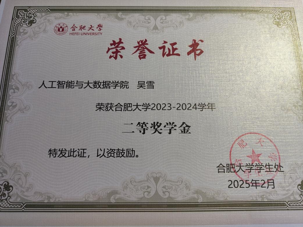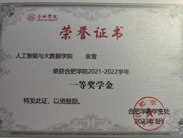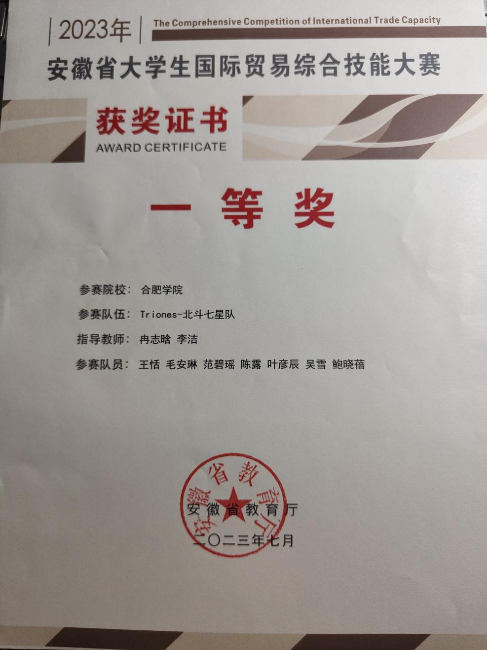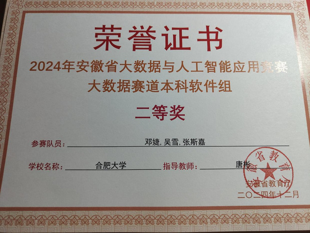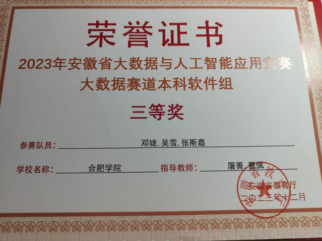 她始终相信“纸上得来终觉浅”,积极参加各类学科竞赛,在 “互联网 +” 比赛中获校级银奖,在安徽省国际贸易综合技能大赛中摘得一等奖。印象最深的是连续两年参加安徽省大数据与人工智能应用竞赛,从三等奖到二等奖的跨越,藏着她与团队在实验室调试代码到凌晨三点的坚持,当算法模型终于跑出理想数据时,那种突破自我的成就感让她至今难忘。这些经历让她体会到了学科交叉的魅力,也让她在学术探索中不断进步。