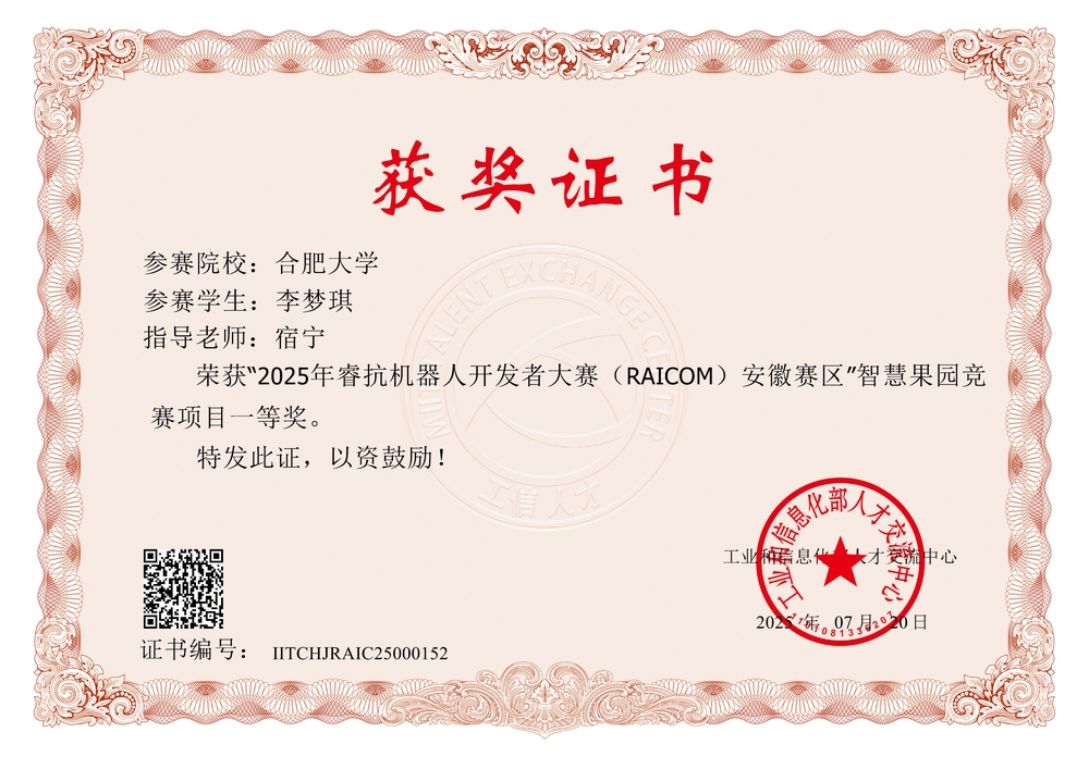 此外,他还勇敢踏上了睿抗机器人开发者大赛的征程。面对全新的赛题与复杂的技术挑战,他主动学习、反复实验,最终在安徽赛区斩获一等奖。虽然过程艰辛,但他始终坚信“比赛不是目的,而是学习的另一种形式”,通过以赛促学,他的专业技能与创新思维得到了全方位提升。