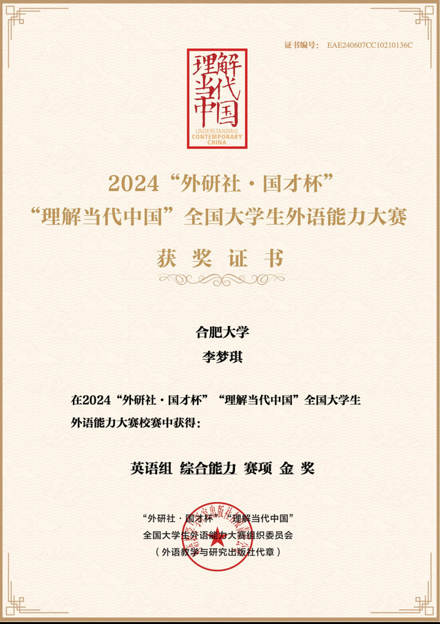 在信息素养竞赛中,他以扎实的检索能力和逻辑思维获得校赛二等奖;在“外研社·国才杯”英语综合能力赛项中,他凭借流利的阅读与出色的写作能力,荣获金奖;在全国大学生英语竞赛中,他又凭实力获得C类三等奖,充分展现了其语言与思辨能力的深厚底蕴。