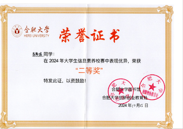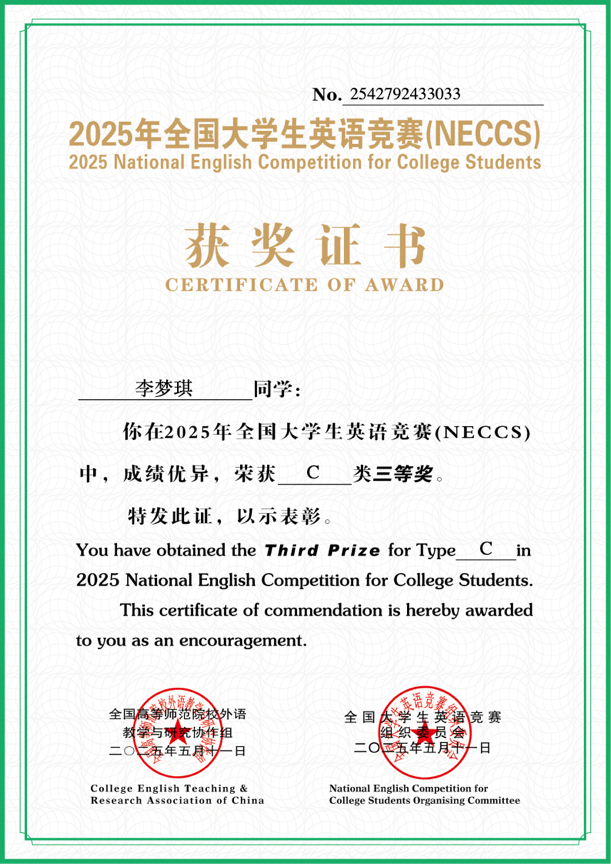 李梦琪始终认为,学习不应局限于课堂,竞赛是验证知识与锻炼能力的重要途径。课余时间,他积极参加各类学科竞赛,将所学知识与实践相结合,在不断挑战自我中收获成长。