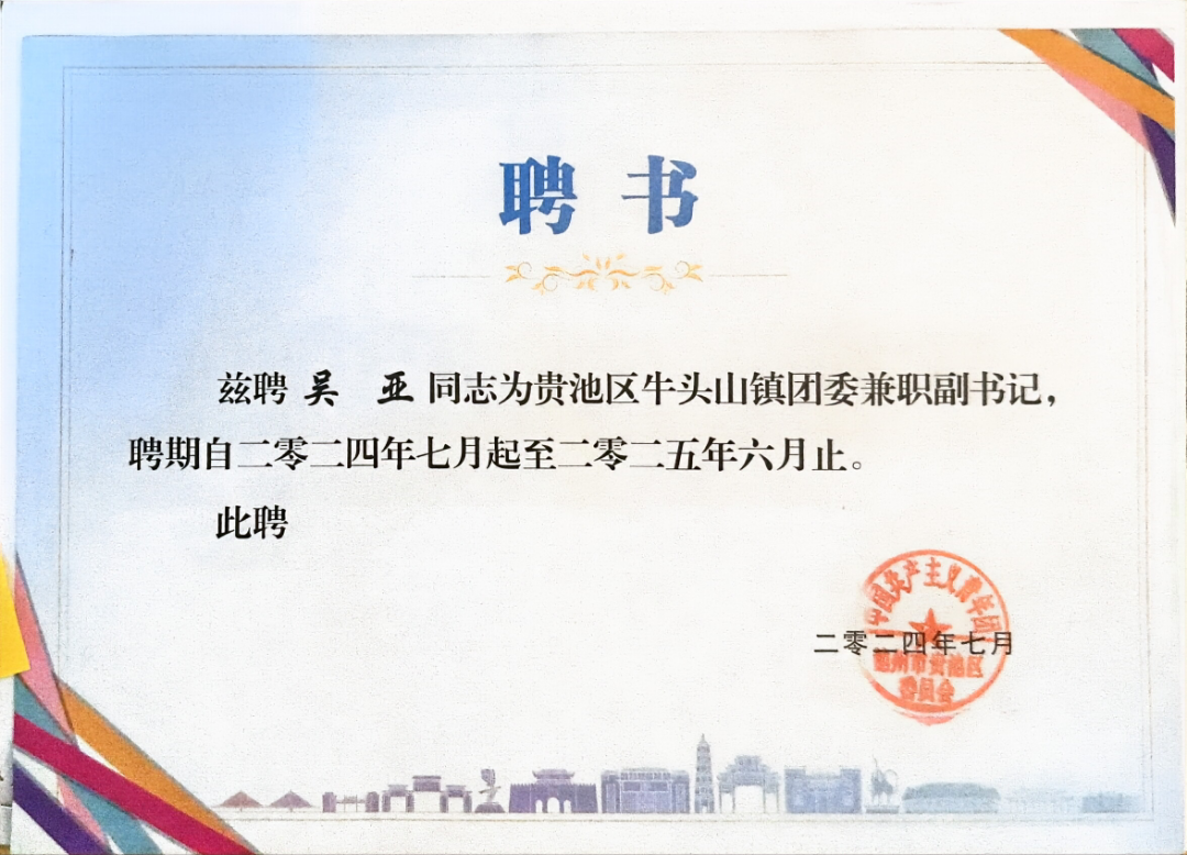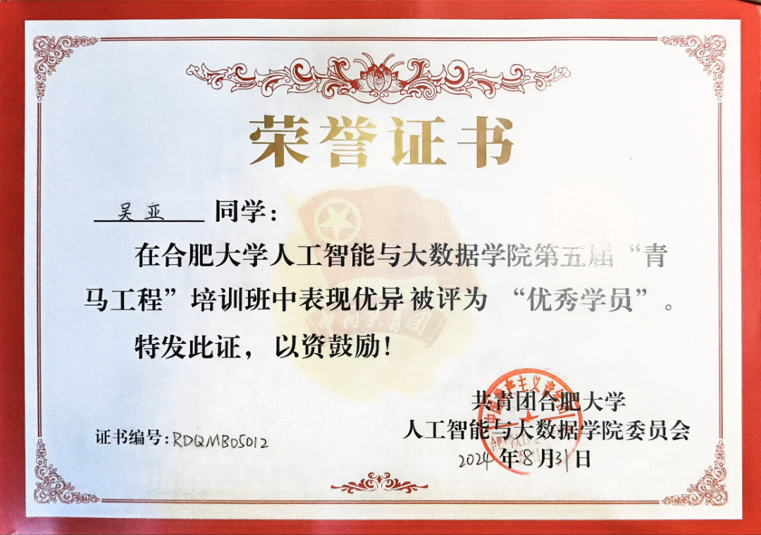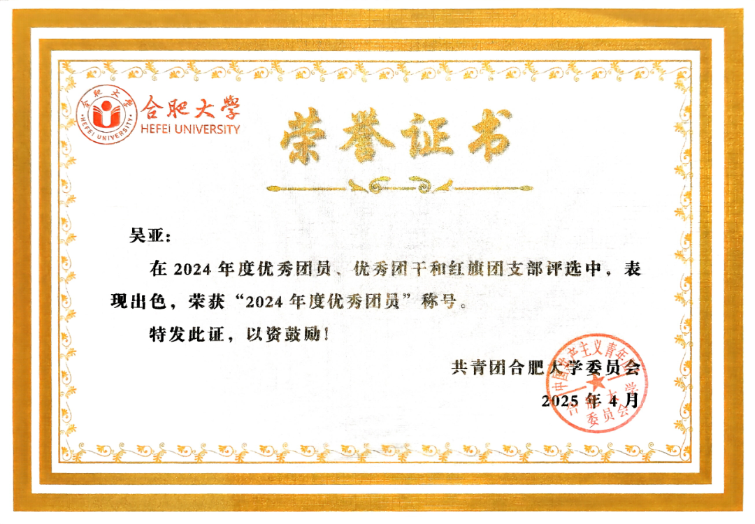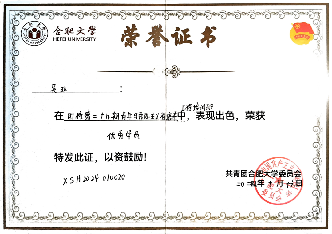 “心有所信,方能行远。”吴亚同学思想积极上进,始终以党员标准严格要求自己,主动发挥先锋模范作用。作为班级团支书,她扎实做好班级团务工作:在“优秀团员”“优秀团干”评选期间,严格按照评选标准整理班级团员表现材料,公平公正完成初筛工作,同时耐心解答同学关于评选流程的疑问。此外,她热心为同学服务,尤其在综合测评工作中,有同学对志愿服务时长认定、竞赛奖项加分标准不明确时,她会结合评定材料逐一解释,还会协助班长核对申报材料的完整性,避免因材料遗漏或格式问题影响测评结果。她曾先后参与院级、校级青年马克思主义者培养工程培训班,在学习期间,她主动汲取理论养分、深耕政治素养,认真参与专题研讨与实践教学,两次培训均获评优秀学员,用实际行动践行初心,传递青春正能量。