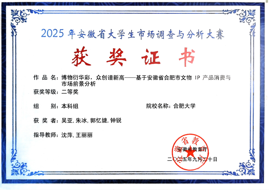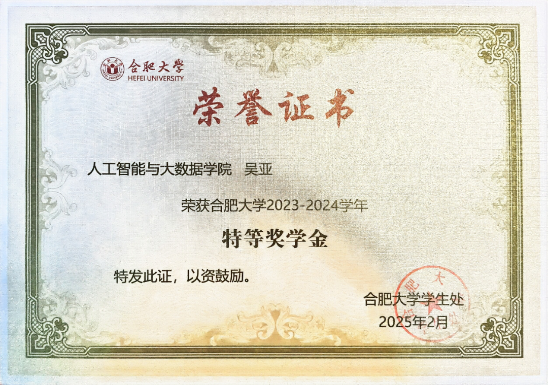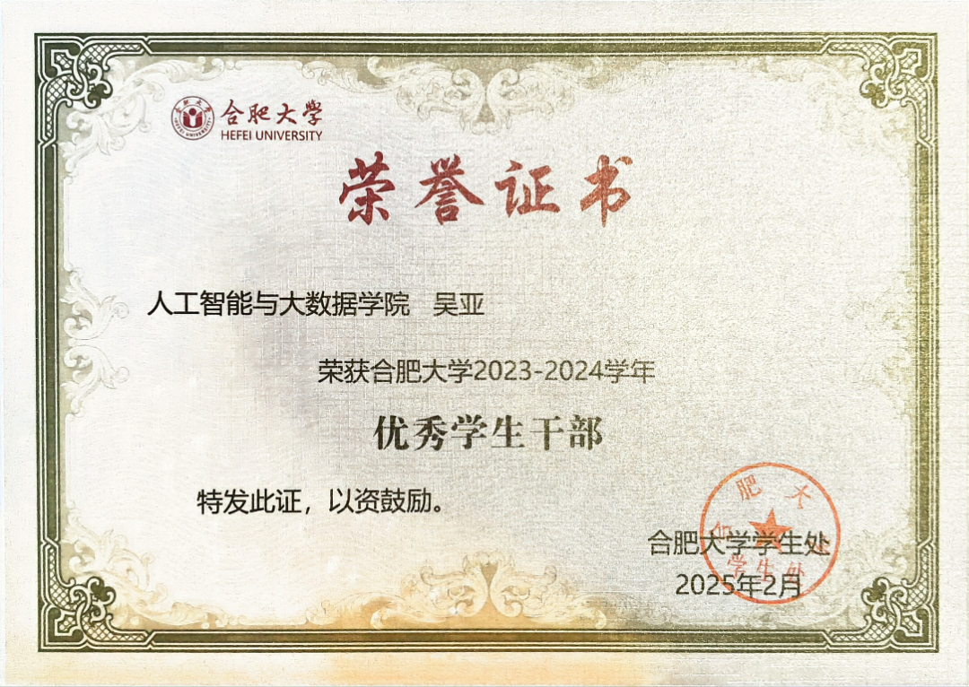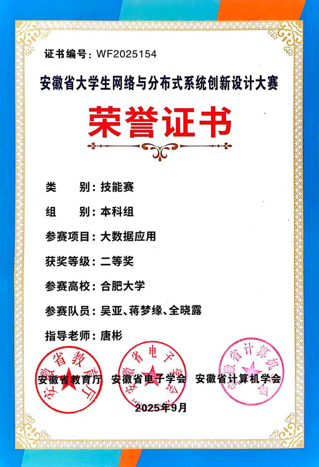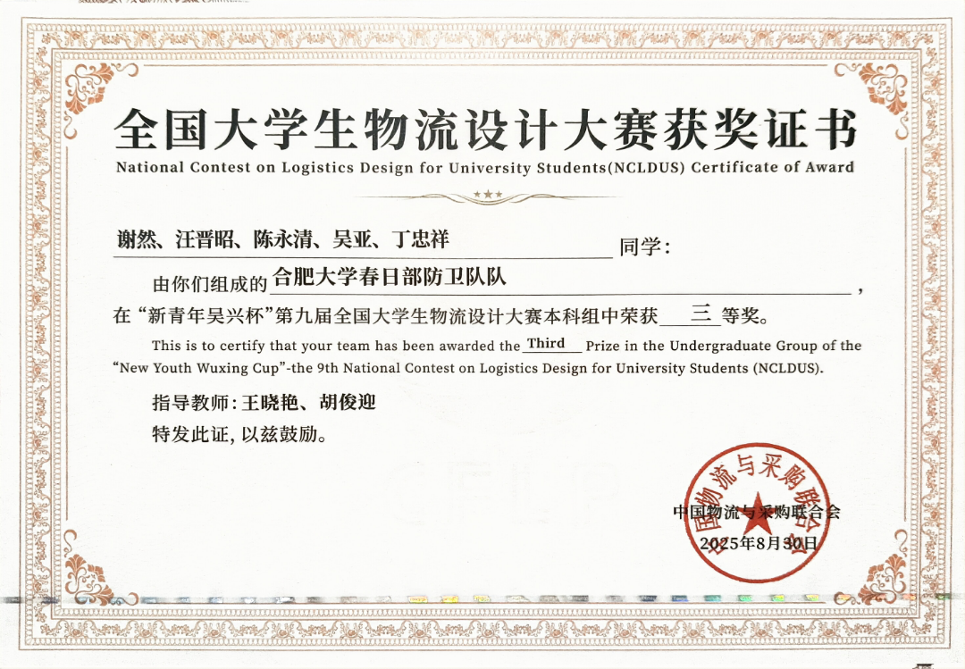 “学所以益才也,砺所以致刃也。”吴亚同学注重将所学知识运用到实践中,积极参与各类学科竞赛。在2025年安徽省大学生市场调查与分析大赛、安徽省大学生网络与分布式系统创新设计大赛中荣获二等奖,在全国大学生物流设计大赛决赛中斩获三等奖,还在2025年全国大学生数学建模大赛安徽赛区获得一等奖。