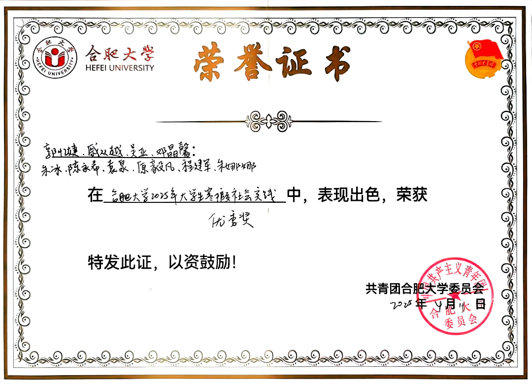 “道虽迩,不行不至;事虽小,不为不成。”吴亚同学始终积极投身校内外社会实践与志愿服务,用行动践行初心。她参与“三下乡”暑期社会实践活动,前往泗县开展支教工作,课堂上耐心授课、细心指导学生,凭借扎实的表现获评“三下乡”优秀个人;参与返家乡实践期间,担任池州市牛头山镇团委兼职副书记,助力基层青年工作开展;同时积极参与寒假社会实践活动,荣获实践活动优秀奖。截至目前,她累计志愿服务时长已达200小时。