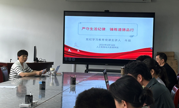 2024618日下午2:00,在36305会议室人工智能与大数据学院党委书记牛欣给两个教工支部作“严守生活纪律,锤炼道德品行”党纪学习教育专题党课,人工智能与大数据学院教工第一党支部、教工第四党支部两个支部的全体党员教师参加。