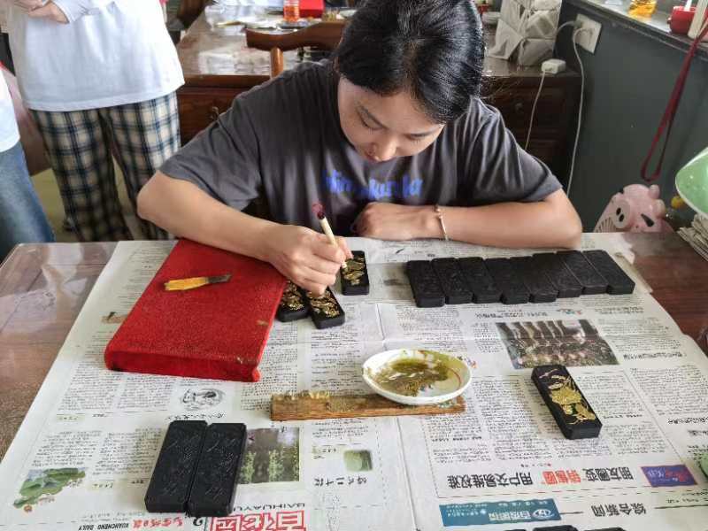 在这里,我们深入了解徽墨从选材到成品的每一道工序,亲手体验制墨的精湛技艺,感受传统手工艺人的执着与坚持。视频组的同学利用相机记录下徽墨制作的全过程,从炼烟的细腻,到和胶的精准,再到杵捣的辛勤,再到锉边、描金,剪辑成视频,致力于宣传匠人的心血与智慧和对于完美的追求与执着,也为宣传和传承传统文化。