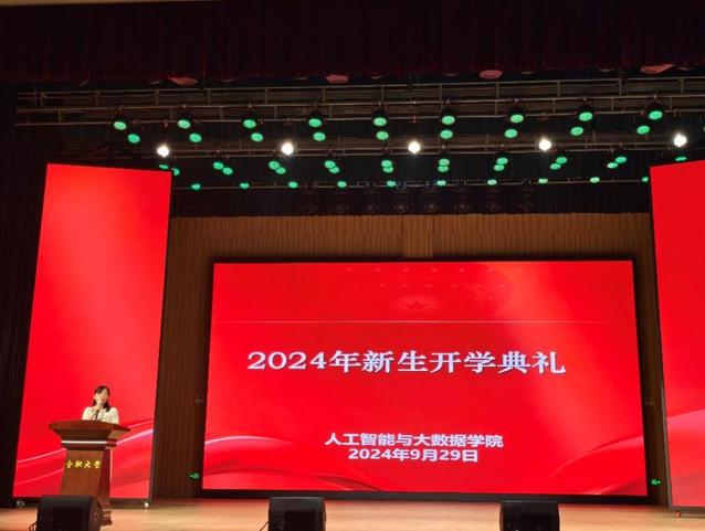 为热烈欢迎2024级新同学,展示学院积极向上的精神风貌,929日下午,人工智能与大数据学院在新大学生活动中心隆重举行2024级本科生新生开学典礼。人工智能与大数据学院党委书记牛欣教授、院长余海峰教授、副院长陈圣兵教授、大数据与信息工程系主任屠菁老师、数学与统计系主任姚玉武老师、副主任牛勇老师、全体辅导员和2024级新生出席,本次典礼由学院党委副书记姚蓓蓓主持。
