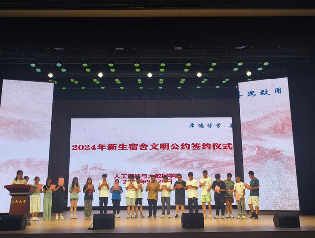 活动最后,举行新生宿舍文明公约签约仪式,姚蓓蓓强调,文明宿舍创建的重要性不仅体现在突出大学生的文明素质、倡导整洁卫生的环境,帮助学生形成良好的生活习惯,更是体现大学生的安全意识和自治能力,对于创造良好的校风和学风也具有重要的作用。随后19位新生代表现场宣读誓词,并签订了《人工智能与大数据学院宿舍文明公约》。