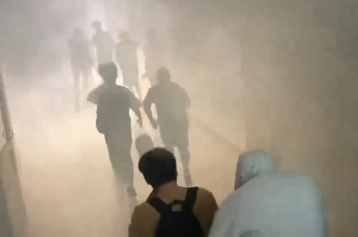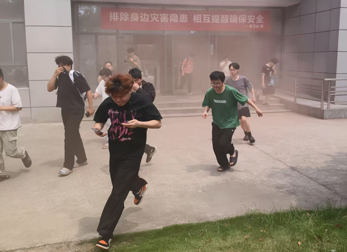 演练内容设置楼宇管理员发现地震来袭,立即发出防震信号,学生就近找坚固地点进行避难,护住头部等身体重要部位;30秒后,立即组织学生向楼外安全地带疏散;同时,由于地震导致一楼一间宿舍冒出浓烟,演练学生在浓烟状态下护住口鼻、低姿快速通过浓烟区,有条不紊地从楼上撤离,来到宿舍楼下开阔处。