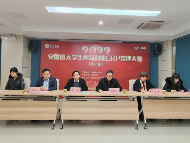 12月16日至17日,2022年安徽省大学生创新创业ERP管理大赛(本科组)在我校举办,来自省内34所本科院校的145支优秀代表队、共900余名师生参赛,比赛采用线上方式举行。经过激烈角逐,我校获得一等奖3项、二等奖2项,我校获最佳组织奖。党委副书记刘建中出席大赛开幕式,安徽省大学生创新创业教育办公室副主任、我校创新创业教育处副处长孙虹,合肥师范学院经济与管理学院副院长黄虹,中国科学技术大学管理学院副教授焦文宇,新道科技股份有限公司安徽省区总经理侯腾飞参加开幕式,开幕式由我校经济与管理学院副院长于娜主持。