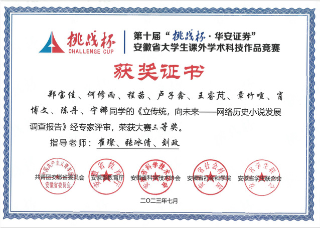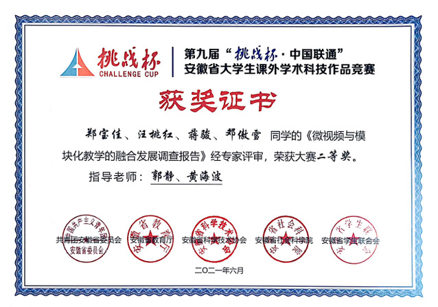 本人注重专业学习与创新能力培养。20216月,为探索影视传媒艺术与教育教学之关系,主持撰写《微视频与应用型高校模块化教学的融合发展》调研报告,并获得第九届挑战杯安徽省大学生课外学术科技作品竞赛(A类赛事)省级二等奖,在《新闻研究导刊》中以第二作者身份发表论文《微视频与应用型高校模块化教学融合发展研究——以地方应用型大学合肥学院为例》;202110月,为献礼党的一百周年,主持《邓恩铭的红色传奇》剧本创作,并获得安徽省大学生微电影大赛省级优秀奖;2023年,主持撰写《网络历史小说发展调查报告—立传统,向未来》并获得第十届挑战杯安徽省大学生课外学术科技作品竞赛(A类赛事)省级三等奖。