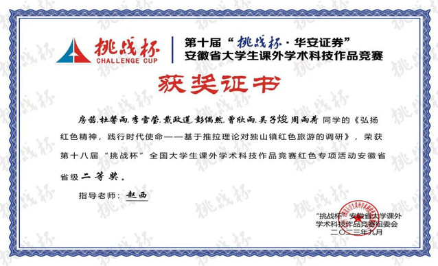 经过辛勤耕耘和团队不懈努力,我们小组项目弘扬红色精神,践行时代使命——基于推拉理论对独山镇红色旅游行为意向调研在第十八届“挑战杯”全国大学生课外学术科技作品竞赛红色专项活动中荣获省级二等奖。这支团队汇聚了21级应用心理学班的房茜、杜馨雨、李雪莹、戴政莲、曾欣雨、吴子焌、周雨荷以及21级土木班的彭偶然。我们以扎实的心理测量、心理统计及SPSS软件应用知识为基石,在指导老师赵西的指导下,怀揣着将所学应用于实际、挑战自我潜能的渴望,踏上了这次充满创新与挑战的旅程。