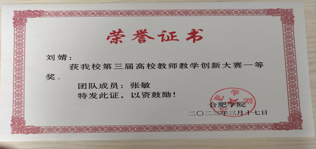刘婧老师带领她的学生彭玮,许海峰,刘凤丽,徐旺旺等人参加了第六届中国国际“互联网+”大学生创新创业大赛,荣获铜奖;除此之外,还带领彭玮,王雪丽,李丹宁参加第九届“挑战杯”安徽大学生课外学术科技作品竞赛荣获二等奖;还指导“乘风破浪队”在安徽省教育厅主办的2021年安徽省大学生服务外包创新创业大赛中荣获二等奖;还有在第七届“互联网+”中获得银奖等等成果。