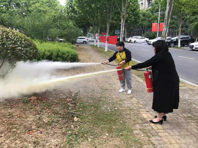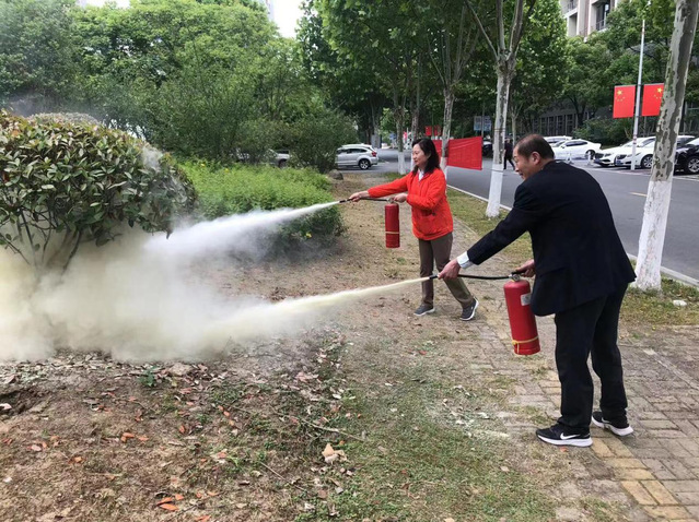 随后,保卫处周老师与全体工作人员一起进行了消防演练。在现场灭火演练中,大家按照灭火器使用“一托、二拔、三拉、四喷”的流程,站在上风口对准火苗根部灭火。